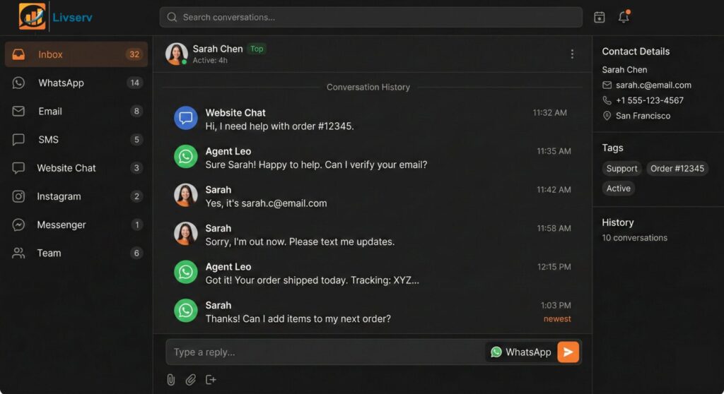 Engage customers across WhatsApp, SMS, email, live chat and all social media platforms, all from a unified inbox. Your AI agent maintains conversation continuity across every touchpoint.