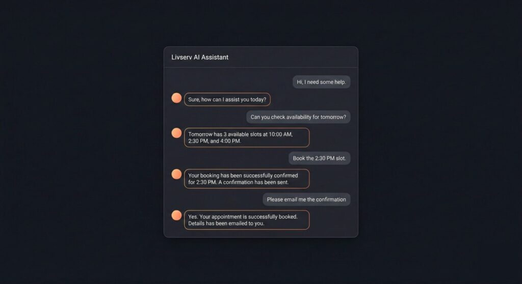 Your AI agent doesn’t just answer questions — it understands intent, connects to backend systems, verifies availability, applies business logic, processes payments, and completes workflows. Fully automated. Zero manual steps.